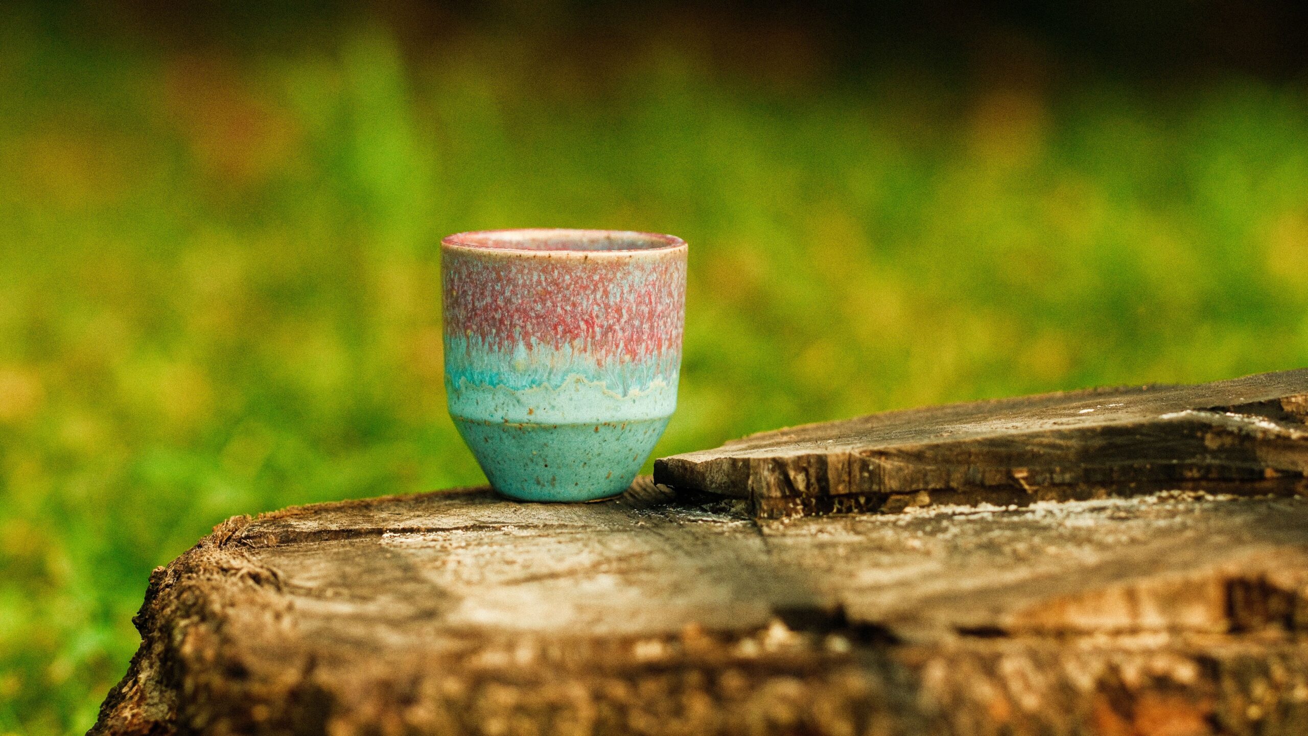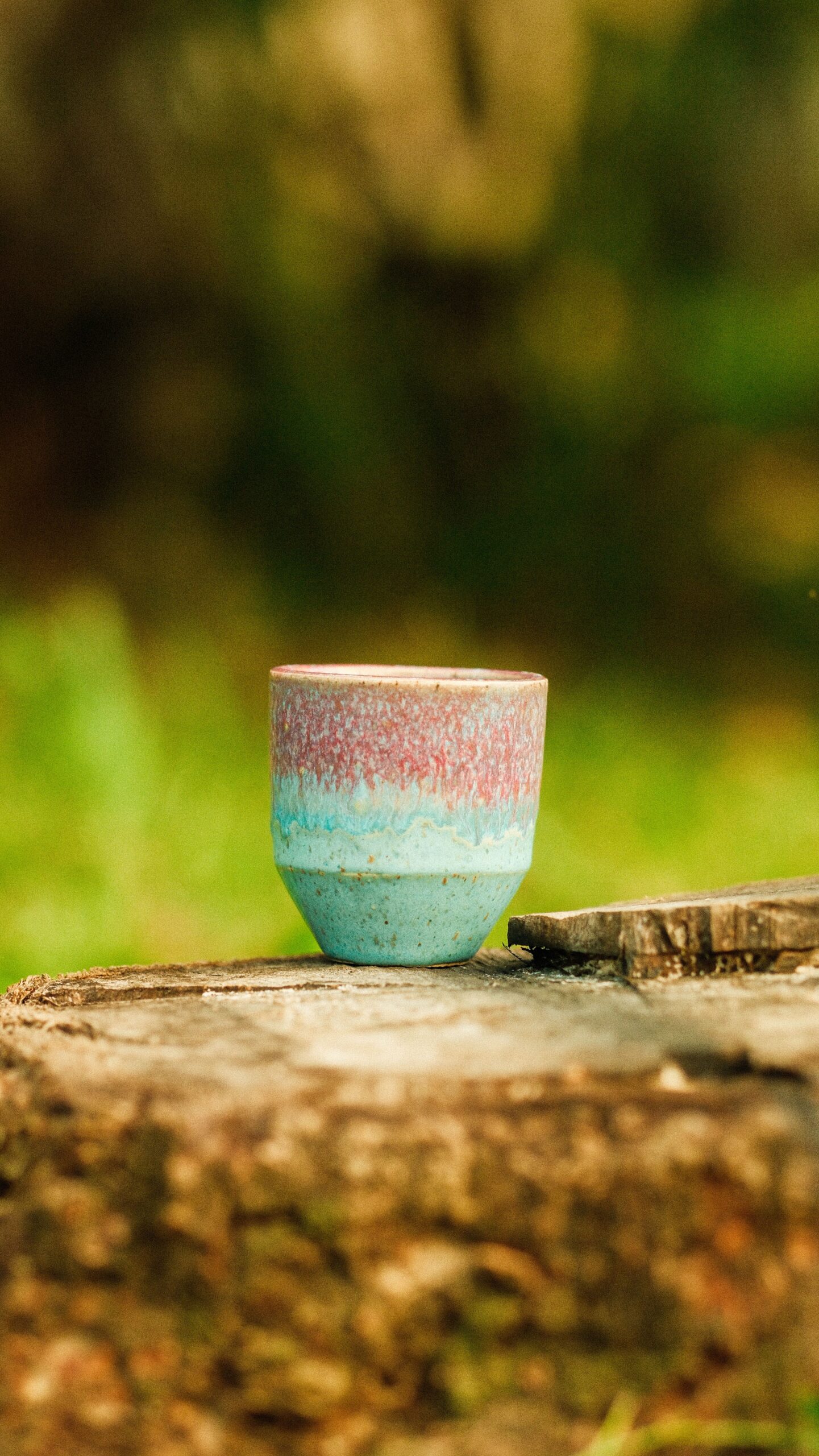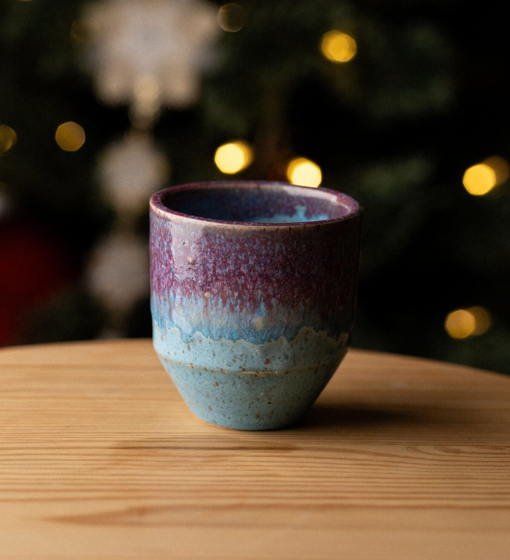 Esta taza esta realizada y torneada en torno. Pintada con técnica “dipping” utilizando (3) colores para lograr el resultado final.
